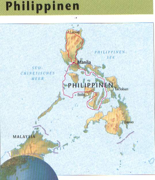 Reisen auf den Phillippinen z.b. mit Passagierfähren aus japanischen Beständen ist durchaus komfortabel,und nicht mehr oder minder gefährlich als in Europa.Auch das Essen an Bord war wirklich gut.Ein ausgezeichnetes Bustransportsystem macht Leihfahrzeuge überflüssig,sieht man mal von irdendwelchen Treks in den Dschungel zu tollen Wasserfällen etc.ab. Das Busreisen in die Phillippinischen Provinzen sollte man nicht mit westlichem Standard messen,dafür entschädigt aber live zu sehen, wie die Menschen ihren Alltag managen müssen. Manila,riesengross ca.8Millionen Einwohner(die illegalen nicht mitberücksichtigt) hat gemessen an seiner Grösse nicht wahnsinnig viel zu bieten im Bezug auf "Sightseeing der Touristenclass",Rizal Park,Hafenrundfahrt,interessante Chinatown sowie Fahrten mit dem "Skytrain"durch die Elendsviertel,wo man die meisten Christlichen(meist Baptistenkirchen)bemerkt. Intramuros ,der alte aus spanischer Kolonialzeit geprägte Stadtteil mit seinen alten Festungsanlagen ist ausserdem sehr sehenswert. Dutzende von Nightclubs, vom schummrigen bis zum Oberexclusiven bieten "Entertainment der besonderen Art". Man findet Discos,Kneipen,Billiard,Kinos und supermoderne Einkaufszentren zum abendlichen Entertainment oder zum shoppen. Leider habe ich die Osterprozessionen in "San Fernando,Provinz Pampangas"auf Luzon knapp verpasst.Einheimische erzählten mir von den grausamen Selbstgeisselungen und Kreuzigungen ,wo sich Religiöse Fanatiker jedes Jahr quälen und sogar ans Kreuz nageln lassen.Sogar der Vatikan verpönt diese Rituale,aber welch Europäer kann die Armut, die Probleme, und diesen echt tief eingeimpften Religionswahnsinn nachvollziehen??? Die Phillipinen haben landschaftlich sehr interessante Varianten zu bieten,die Menschen sind Ausländern gegenüber nicht übertrieben ,eher reserviert freundlich. Macht grossen Spass Individuelle zu reisen .(s.Karte Phillippinen) |