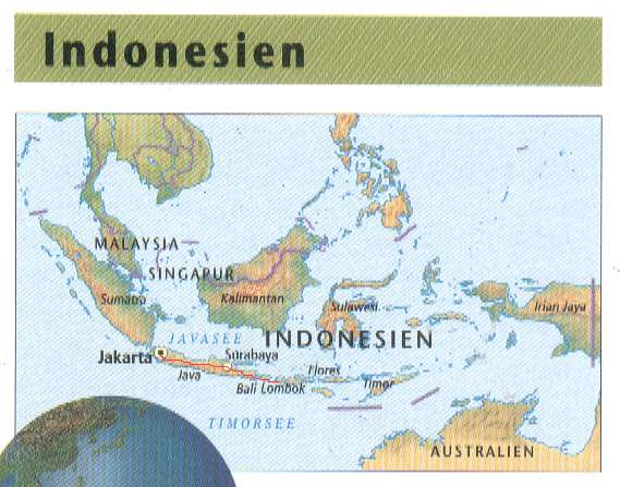 Komfort muss bezahlt werden auf der ganzen Welt,deshalb bestimmt Ihr euren Reisepreis im ganz Wesentlichen selbst.Meine Reise z.b.1993 mit dem Luxusvorzeigezug über Java(Indonesien)nach Bali (der Insel der Götter) war um ein mehrfaches teurer als mit Standardzügen.(War aber trotzdem noch preiswert).Dasselbe gilt natürlich für Zimmer etc.(verzichtet ihr auf Aircon und begnügt euch stattdessen mit grossem Deckenventilator)gibt es alles sauber und viel preiswerter. Jakarta auf Java ,Hauptstadt Indonesiens, bestehend aus ca.16000 Inseln und grösstes Moslemisches Land der Erde bietet dem Besucher auf den ersten Blick was viele andere Asiatische Metropolen auch bieten.(Chaos,Lärm,Gestank etc.) Aber es gibt auch Interessantes zu sehen wie z.B.den Segelschiffhafen in "Altbatavia"wo verwegene Gestalten die aus einem Piratenfilm entsprungen sein könnten,per Menschenkraft die Ladungen von Holzbooten löschen ,die von irgendeiner der vielen Gewürzinseln angesegelt kommen. Exotische Vögel,Affen,Holz,Zement,mit allem wird gehandelt. Im alten Stadtzentrum wird der ehemalige holländische Kolonialeinfluss deutlich,nicht zuletzt zu bemerken am Unabhängigkeitsmonoment wo im Keller ein eindrucksvolles Museum wirklich Gute Info aus dieser Zeit darstellt. Alte Gebäude aus dieser Zeit befinden sich ganz in der Nähe,zum Teil geöffnet für Publikum. Java ist sehr überbevölkert, und aus Mangel an Zeit bin ich fast übergangslos mit nur einem Stopover In Surabaya für 2-3 Tage, auf Bali der einzigsten meines Wissens nach Hinduistischen Insel Indonesiens gelandet. Tolle Eindrücke auch die vorgelagerten Inseln "Penida Und Lembongan" zu erkunden und mit einheimischen Fischern rauszufahren zur "Seaweeternte". Bali ist wunderschön aber stellenweise sehr touristisch.Als Asieneinstieg sehr zu empfehlen. Es mangelt an nichts ,Publictransport,Leihfahrzeuge,Restaurants,Warungs und Entertainment stehen satt zur Verfügung.(Vielleicht um ein paar Tage Urlaub vom Reisen zu machen??) Kulturell und Landschaftlich wird es auf Bali nie langweilig.Beinahe jede Woche mindestens einmal feiern die Balinesen eine andere Farben und Blumenprächtige "Zeremonie" an der teilzunehmen sich echt lohnt.Ich habe Menschen sich in Trance tanzen sehen die völlig entrückt und verzückt ihre Rolle auf dieser Zeremonie gespielt haben.Künstlerdörfer wie z.B.Ubud im Hinterland sind ein unbedingtes Muss zu besichtigen.Mit Motorrad oder Jeep empfehlenswert die ganze Insel mal zu umrunden.Vorsicht ist auf den sehr schmalen Strassen geboten,ausserdem Harley picsverkehr. (s.Karte Indonesien) |